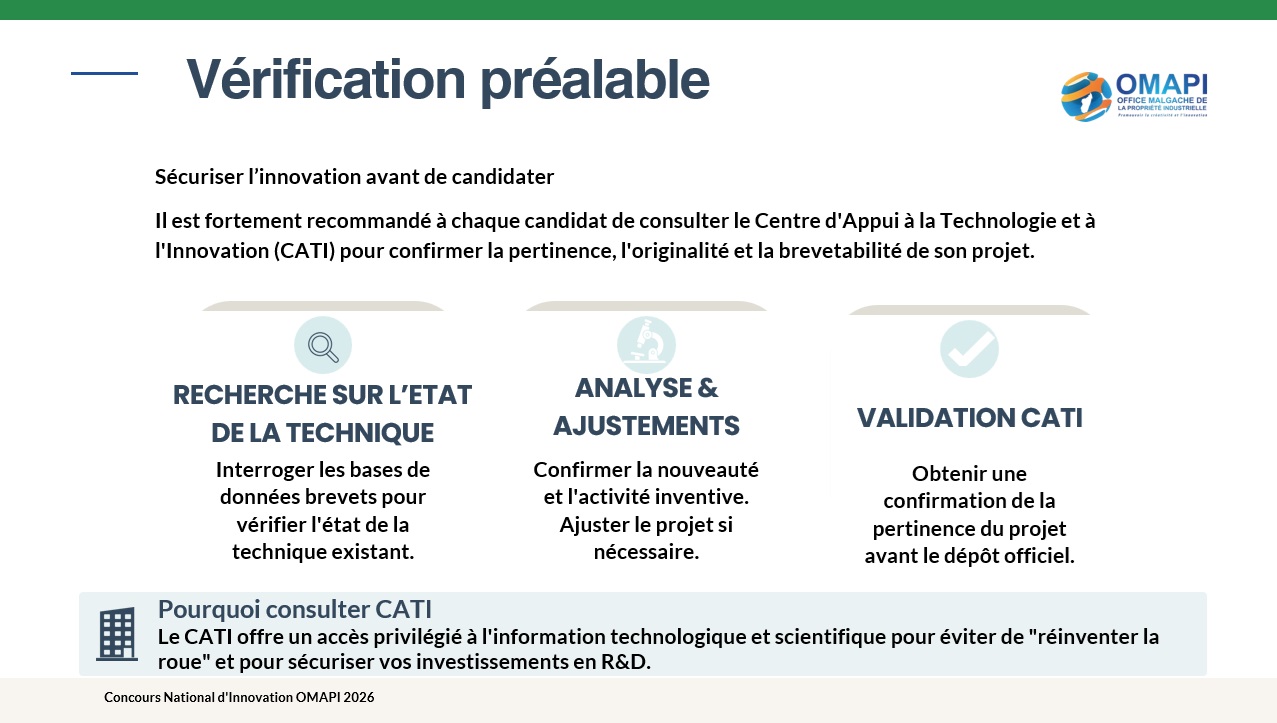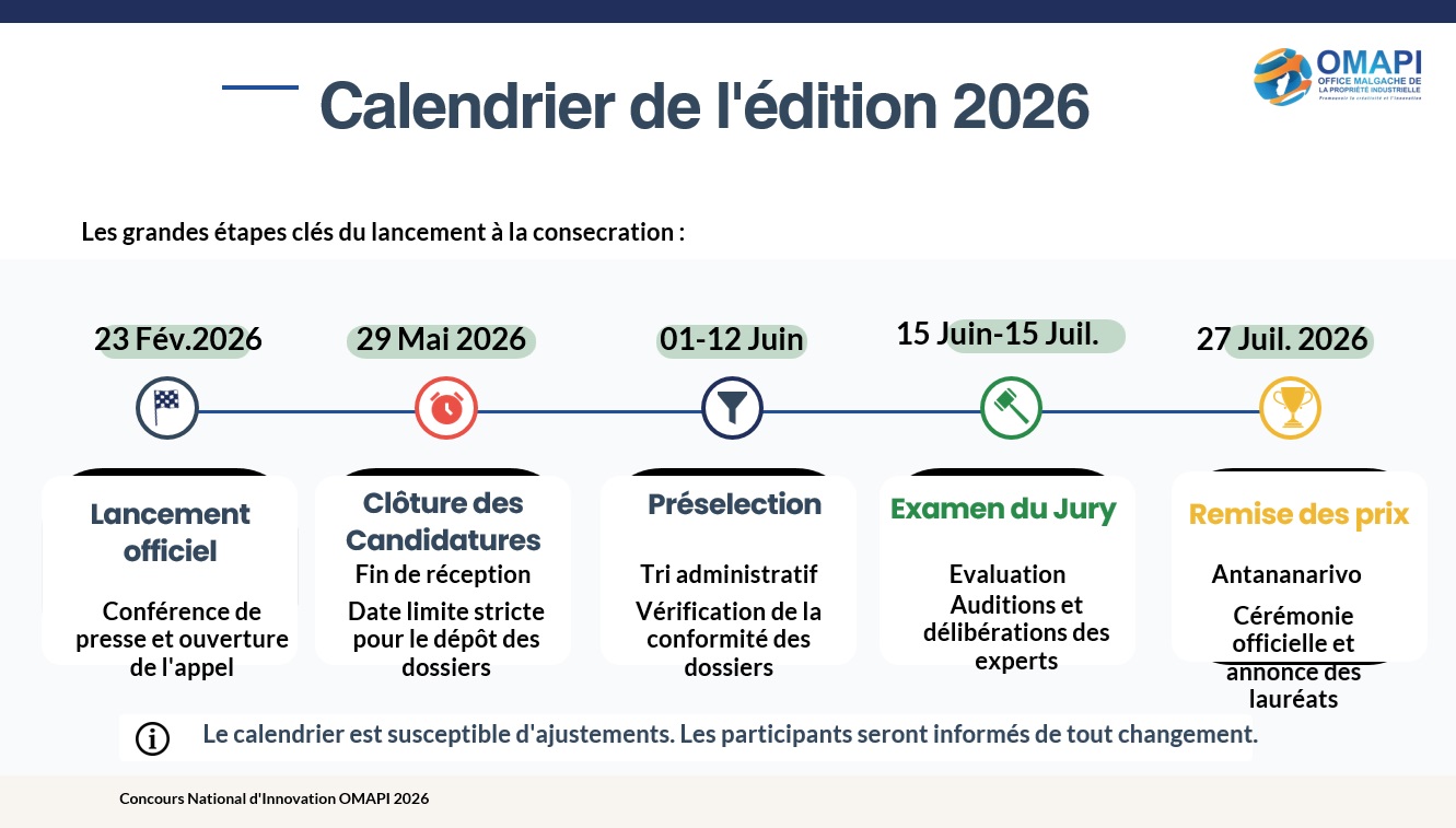 Dans le cadre de sa mission de promotion de l’activité inventive à Madagascar, l’Office Malgache de la Propriété Industrielle (OMAPI) organise un Concours National d'innovation intitulé "La Propriété Industrielle et l'innovation au service de l'industrialisation" pour stimuler la créativité locale et accompagner les talents vers l’industrialisation.